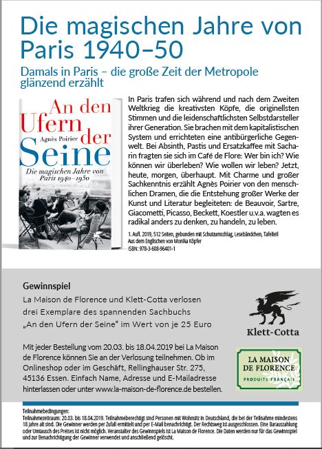 In Kooperation mit dem Klett-Cotta Verlag verlose ich 3 Exemplare des spannenden Sachbuchs „An den Ufern der Seine“ von Agnès Poirier, das am 28.02.2019 erschienen ist. Das Sachbuch im Wert von je 25€ umfasst über 500 Seiten, gebunden mit Schutzumschlag und Lesebändchen.