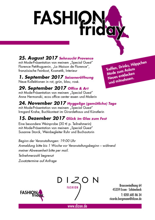 DIZON Fashion lädt in Kooperation mit La Maison de Florence zum „FASHION Friday“ am 25.08.2017 um 19.00 Uhr, im Brausewindhang 64, 45359 Essen-Schönebeck ein – Treffen, Drinks, leckere französische Häppchen, Mode, Neues entdecken und mitnehmen.