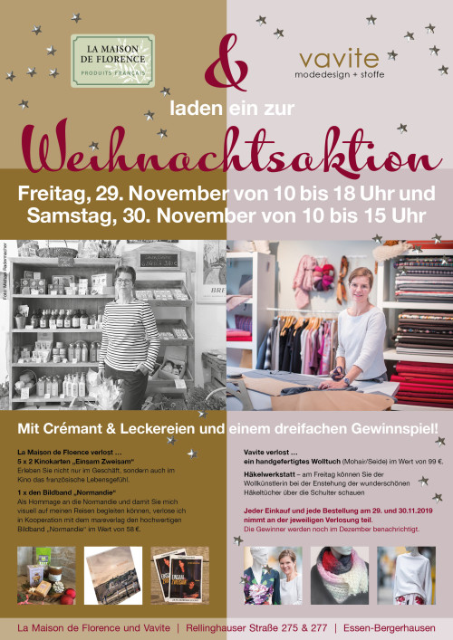 Am Freitag 29.11 (10.00 – 18.00 Uhr) und Samstag 30.11.2019 (10.00 – 15.00 Uhr) findet eine Weihnachtsaktion mit Crémant, kleinen Leckereien und einem dreifachen Gewinnspiel bei „La Maison de Florence“ und im Nachbargeschäft „Vavite“ statt. Weil wir unsere Kunden schätzen, haben wir uns vorgenommen, Sie immer wieder mit besonderen Specials zu überraschen.