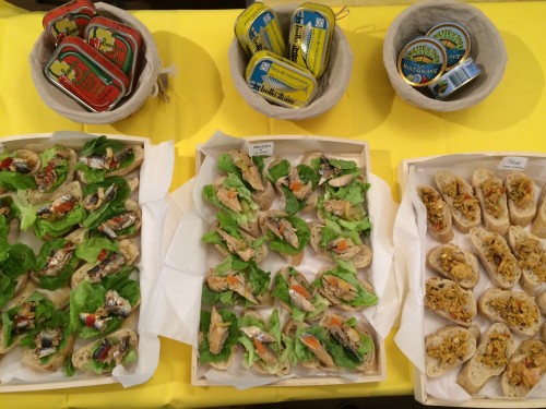 Kleine Häppchen mit Sardinen in Chilli, Makrelenfilet in Weißwein und Thunfisch à la Marie-Galante. Verkostung: Olivenöl vom Landgut Salvator und Honig von der Mieterin du Bousquet.