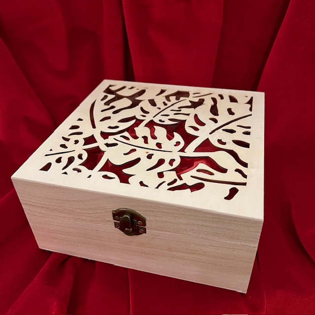 Entdecken Sie diese schließbare und nachhaltige Holzkiste mit schönen blätterförmigen Ausstanzungen gefüllt mit Bio-Lebensmittel.