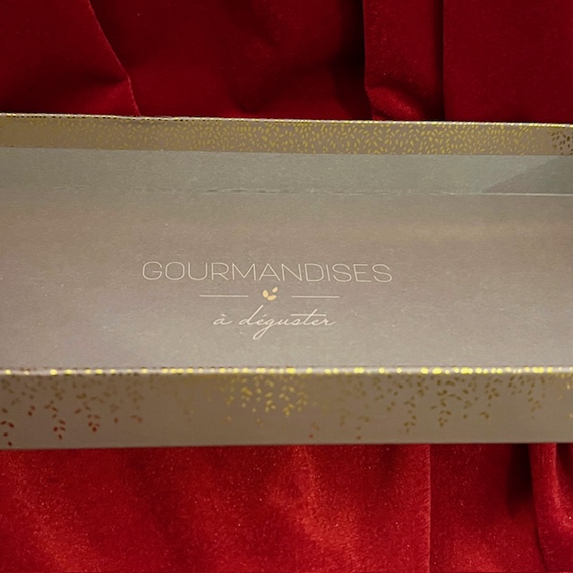 Im Inneren des Präsentkorbes steht in geschwungener Schrift „Gourmandises à déguster“ (Köstlichkeiten zum Genießen).