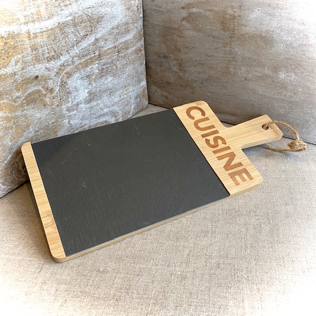 Die dekorative Servierplatte aus Holz mit eingelegter Schiefertafel eignet sich zur appetitlichen Präsentation von Käse-, Wurst, Fischspezialitäten, Tapenaden, Olivenöl und Fleur de sel.